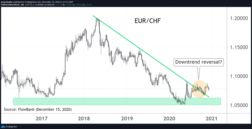 Comme indiqué en introduction, une des mesures appliquées aux pays inclus dans la liste est l’intervention du FMI pour demander réparation du préjudice. Rappelons que le FMI a qualifié en début d’année d’appropriée la politique monétaire suivie par la Confédération. Il est dès lors probable que les États-Unis se contentent d’émettre un simple avertissement supplémentaire à la Suisse plutôt que de mettre en place des sanctions. Un tel scénario pourrait ajouter une pression supplémentaire à la baisse sur le franc suisse contre l’euro. Comme le montre le graphique ci-dessous, l’EUR/CHF a d’ailleurs cassé sa tendance baissière cet été. Une décision clémente de la part de Washington pourrait renforcer la tendance haussière de l’euro. A moins que de mauvaises nouvelles économiques ne ressurgissent…