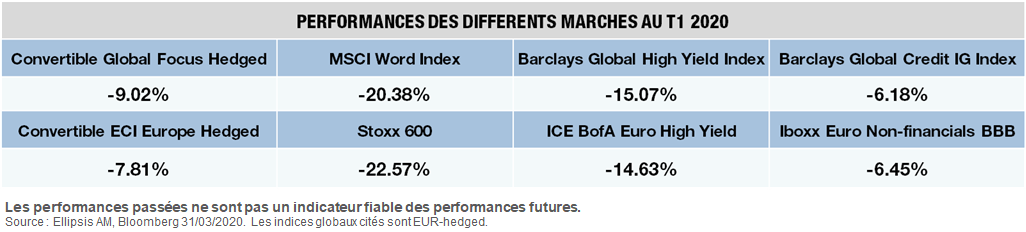 Les convertibles globales réalisent sur le mois de mars -9,09% (indice Reuters Global), comparé à des indices actions qui ont souffert de -13,47% pour le MSCI World Index, tandis que les obligations classiques ont affiché de fortes baisses (-13,55% pour le Barclays Global High Yield Index et -8,82% pour le JP Morgan Global IG Index).