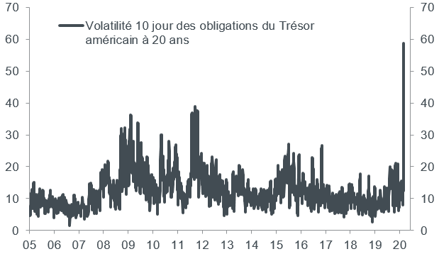 Source : Bloomberg, Janus Henderson Investors, 3 mars 2005-13 mars 2020. Présente la volatilité réalisée sur 10 jours pour les bons du Trésor américain à 20 ans.
