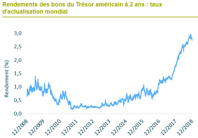 Si les experts tentent de justifier les performances négatives de 90% des classes d'actifs en 2018 par l’impact des politiques populistes (Brexit, instabilité en Italie, élections d’AMLO au Mexique et droits de douane partout dans le monde, pour ne citer que quelques exemples), la véritable cause pourrait être bien plus simple: le taux d'actualisation mondial de facto, à savoir le rendement des bons du Trésor américain à 2 ans, a progressé de près de 100 points de base (pb) durant l'année, entrainant par conséquent une réévaluation des différents actifs mondiaux. Quelles en sont les raisons?