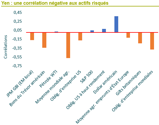 Seul le yen a (à peu près) tenu tête à l’envolée du dollar cette année. En dépit de la fragilité économique du pays et du plan de relance à plusieurs milliards de yen de la banque centrale, la devise nipponne continue d’offrir une certaine protection aux investisseurs, que ce soit grâce à son statut de valeur-refuge, ou de la diversification qu’elle permet aux investisseurs américains et européens. Comme l’indique le graphique ci-après, la devise est faiblement corrélée aux actifs risqués, et elle est même négativement corrélée à l’indice Bloomberg Barclays Global Aggregate, qui constitue le baromètre des marchés obligataires. À titre d’exemple, le yen s’est renforcé face au dollar entre la mi-juillet et la mi-août de cette année, alors que les turbulences atteignaient un sommet en Argentine et en Turquie, pénalisant au passage les marchés émergents et du crédit.