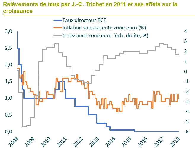 La Banque centrale européenne (BCE) a également commencé à diminuer son programme QE, d’abord en réduisant ses achats d’obligations mensuels, avant d’y mettre un terme d’ici la fin de l’année. Ce tour de vis devrait avoir lieu malgré les turbulences observées sur les marchés obligataires italiens (le rendement du BTP à 10 ans a atteint 3,68% au cours du dernier trimestre, impacté par les inquiétudes qui entourent l’avenir de l’Italie au sein de la zone euro et la viabilité de la dette du pays) et en dépit du taux de l’inflation sous-jacente, qui s’obstine à rester autour de 1%, bien en-deçà de l’objectif de 2% fixé par la BCE. Est-il possible que le Président de la BCE Mario Draghi fasse la même erreur que son prédécesseur Jean-Claude Trichet en 2011 en durcissant trop tôt sa politique monétaire (ligne bleue sur le graphique ci-contre), et en freinant ainsi une économie fragile (ligne grise) dont les seules forces inflationnistes proviennent de la hausse des cours du pétrole (ligne orange)?