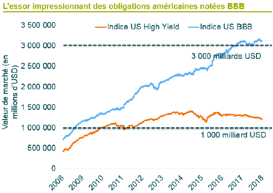 Si le tarissement de l’offre a par le passé soutenu les obligations à haut rendement, le revirement a pesé sur les obligations d’entreprise Investment Grade (IG) cette année. Ces dix dernières années, l’argent bon marché a permis aux entreprises américaines Investment Grade d’émettre des milliards de dollars de dette, souvent utilisée pour augmenter les dividendes ou procéder à des rachats d’actions, améliorant ainsi le cours des actions. La valeur de marché du segment Investment Grade tout juste supérieur à la catégorie spéculative (BBB), a en réalité atteint 3 000 milliards de dollars, soit plus de deux fois son volume dix ans plus tôt. Aujourd’hui, elle atteint presque trois fois la taille du marché des obligations américaines à haut rendement dans son ensemble, ce qui soulève des inquiétudes quant à l’impact d’éventuels abaissements de note au sein de cet univers.