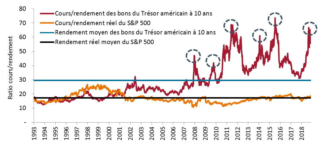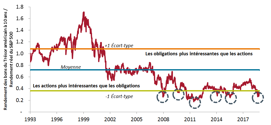 Les données historiques montrent qu’en général, le rendement des bons du Trésor à 10 ans est inférieur au rendement réel de l’indice S&P 500, puisque les bons du Trésor sont moins exposés au risque que les actions. Le ratio bon du Trésor à 10 ans/S&P 500 devrait donc se maintenir systématiquement en dessous de 1,0, ce qui a généralement été le cas au cours des dernières décennies. De fait, depuis près de 30 ans, le ratio moyen a été d’environ 0,7, le rendement moyen des obligations du Trésor à 10 ans s’établissant à 4,1 % et le rendement réel moyen du S&P 500 à 6,0%, soit un écart de 1,9%.