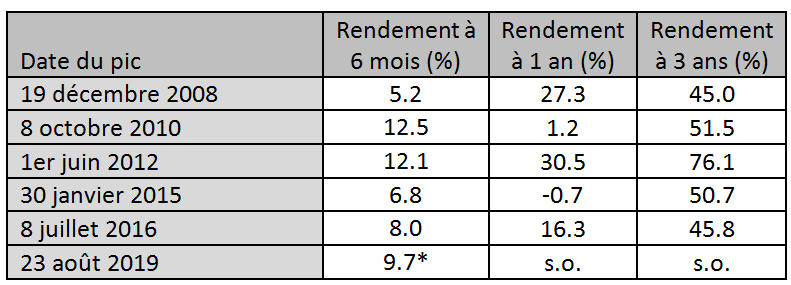 Source: Bloomberg, Janus Henderson Investors. *Les rendements ultérieurs correspondent ici à la période du 23 août 2019 au 20 novembre 2019, et non aux six mois suivants. Les performances passées ne préjugent pas des performances futures. La valeur d’un investissement et ses rendements peuvent augmenter ou diminuer et vous pourriez ne pas récupérer l’intégralité du montant investi à l’origine.