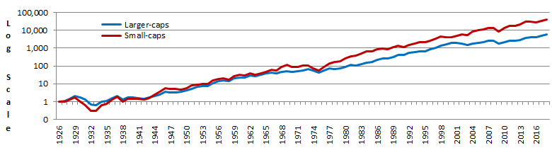 Le Centre de Recherche sur les Cours des Valeurs Mobilières de la Booth School of Business de l’université de Chicago a retracé le plus long historique existant de la performance des indices boursiers par catégorie de capitalisation. Un dollar investi dans les grandes entreprises américaines en 1926, avec réinvestissement des dividendes, rapportait 5 767 dollars à fin 2017, alors qu’un investissement similaire dans les petites capitalisations voyait sa valeur atteindre 38 842 dollars, soit supérieur de plus de six fois1. Une prime de rendement annuelle de 2% aboutit à une somme significative lorsqu’elle s’accumule sur plusieurs décennies.