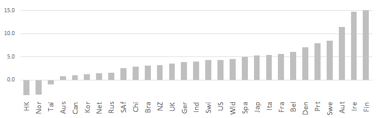 Rolf Banz, doctorant à l’université de Chicago, fut le premier à identifier la prime accordée aux petites capitalisations américaines en 19813, ouvrant la voie à des travaux similaires à travers le monde. Dans une étude de 2018, les professeurs Dimson, Marsh et Evans de la London Business School ont donné une vue d’ensemble mondiale du phénomène4. D’après leurs calculs, la prime des petites capitalisations ressortirait à 5% par an pour les 21 principaux pays de l’indice FTSE World entre 2000 et 2017. En outre, les petites entreprises auraient fait mieux que l’ensemble du marché dans 18 des 21 pays en question (cf. graphique 4).