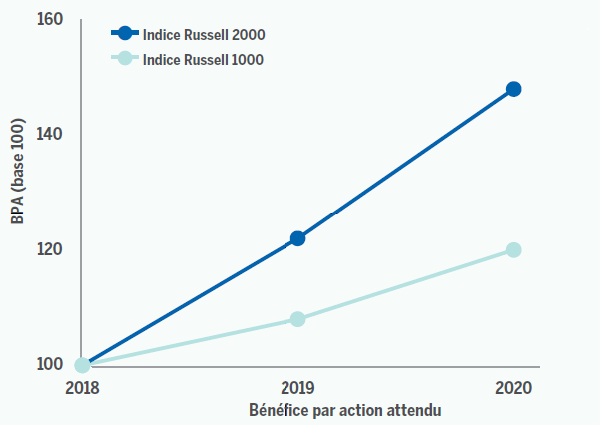 Au cours des deux prochaines années, la croissance des bénéfices par action des sociétés à petite capitalisation boursière devrait dépasser celle des grandes entreprises. Ce qui mettrait un terme à la tendance observée ces derniers temps, avec une croissance du BPA semblable chez les petites comme les grandes capitalisations. (Malgré tout, la sous-performance des petites capitalisations ces dernières années s’explique peut-être par le pessimisme dont ont fait preuve les investisseurs face aux craintes de récession.)