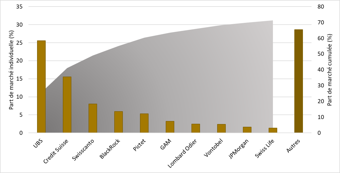 Part de marché des 10 plus gros acteurs (échelle de gauche) et parts cumulées (échelle de droite).