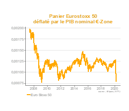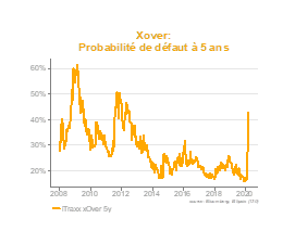 Un scénario central d’une baisse très brutale de l’activité est déjà reflété par la baisse récente des prix des actions européennes et des obligations high yield. Si l’on ajuste un panier EuroStoxx50® de la valeur de la production (le PIB nominal), il apparait que le plus bas récent est très proche de celui de celui atteint en mars 2009. Sur le crossover, la probabilité de défaut cumulée à 5 ans a atteint 47%, là aussi reflétant un pessimisme très marqué.