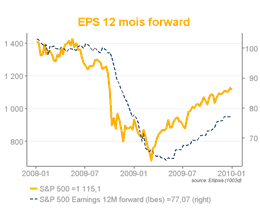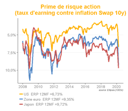 En termes de prime de risque, les grands marchés d’actions retrouvent des zones de valorisation visitées en 2009, avant les révisions (toujours tardives des eps 12m forward :-30% en 2009, enclenchées après la principale jambe de baisse).