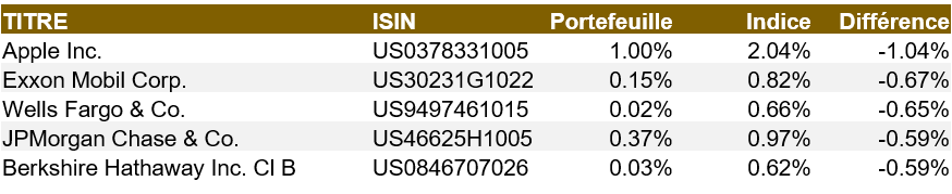 5 titres les plus sous-pondérés du portefeuille (source: amLeague, données au 28.02.2018)