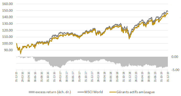 Reste un point à lever: la compétition actions internationales créée avec l’aide du GIP en décembre 2011 a pris pour benchmark le STOXX 1,800. Celle afférente aux actions internationales créée par l’ERAFP en décembre 2015 a retenu le MSCI World (developed markets). Il se trouve que la corrélation entre ces deux indices est constamment supérieure à 99%, et que leurs performances respectives pour 2019 ont été de 30.00% et de … 30.02% ! On parle bien de la quasi même chose.