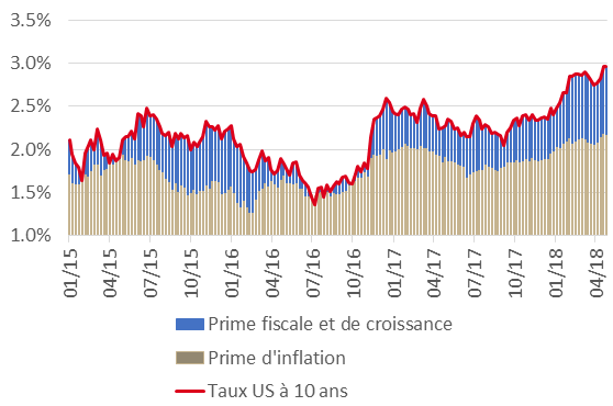 La première question tout d’abord, il existe quatre grands facteurs qui expliquent l’évolution des taux longs: une prime de croissance, une prime d’inflation, une prime fiscale et une prime de liquidité (graphique 1). Si la liquidité des obligations du Trésor américain ne constitue pas un risque, la prime d’inflation explique une large part de la récente remontée des taux: des 160 points de base de remontée de taux depuis juillet 2016, les anticipations d’inflation en expliquent la moitié.