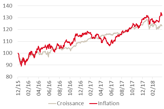 Si l’étude de la Fed est juste, c’est donc une quarantaine de points de base de la remontée des taux qui s’explique, laissant une autre quarantaine de points de base pour la prime de croissance. Une façon de confirmer cette estimation est d’observer la performance des actifs une fois groupés sous la forme de paniers «croissance» et «inflation» en fonction de leurs sensibilités à ces deux phénomènes.