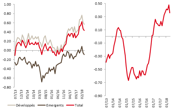 Nos indicateurs de risques macro (nowcasters) semblent pour le moment continuer à pointer vers un ralentissement de la croissance depuis des niveaux élevés ainsi qu’une poursuite du risque d’inflation (graphique 3). Cette montée d’incertitude pourrait amener à la formation d’une prime de risque pour cette incertitude montante, ce qui constituerait une mauvaise nouvelle pour les marchés dans leur globalité.