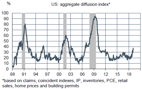 On observe des faiblesses dans un plus grand nombre de secteurs, comme l’industrie, la consommation, l’immobilier résidentiel (voir les graphiques détaillés de diffusion sectorielle et géographique ci-dessous). Géographiquement aussi, le ralentissement concerne davantage d’états. L’indice agrégé de diffusion, dont le passage au-dessus de 50% a précédé ou marqué le début des trois précédentes récessions, était à 37% en février2 au plus haut depuis 2010 (graphe de diffusion des données d’activité). En revanche, le critère d’intensité n’est cette fois pas rempli.