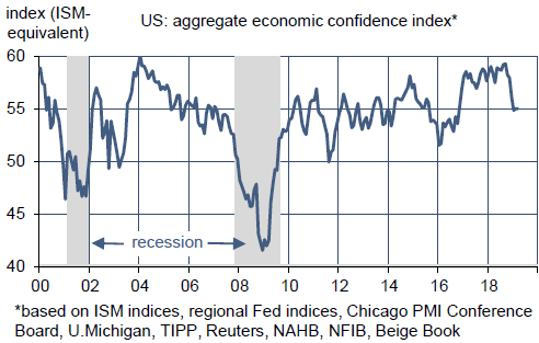 L’agrégation des indices de confiance disponibles montre certes une nette baisse comparée à 2018 mais le niveau absolu reste solide à 55 pts en mars vs un point bas à 51.5 en janvier 2016 (graphe de l’indice agrégé de confiance). La situation présente est sans doute moins confortable car c’est l’ensemble de l’économie qui est vulnérable en cas de choc exogène, par exemple d’origine financière. C’est pourquoi les probabilités de récession tirées des modèles usuels sont plus hautes qu’il y a trois ans. Elles restent toutefois minoritaires.