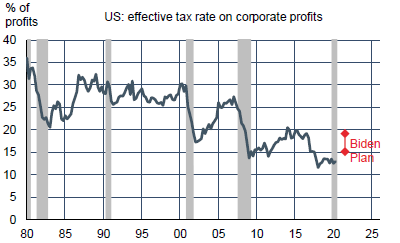 La principale mesure serait d’alourdir la taxation des hauts revenus (0.5pt de PIB par an) via une hausse du taux maximal de 37% à 39.6%, l’élimination du taux de 20% sur les revenus de capitaux, des limites sur les déductions, etc. Le but est redistributif (financement d’autres déductions, par exemple pour la garde d’enfants). Une autre mesure-phare est la hausse du taux d’impôt sur les sociétés qui passerait de 21% à 28%. Il était de 35% avant la réforme fiscale de 2017. Le taux effectif est bien plus bas, il pourrait remonter (graphe). Des taux minimum seraient instaurés pour limiter les possibilités d’évasion fiscale. Cette mesure couterait 0.7 pts de PIB par an. En incluant d’autres ajustements secondaires, le plan Biden prévoit une hausse des recettes entre 0.9 et 1.3 points de PIB par an.