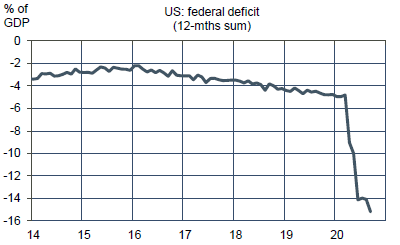 Les deux mesures durables les plus coûteuses sont une extension de l’assurance-maladie publique et le financement direct de l’éducation supérieure (pour environ 1pt de PIB). Le plan prévoit aussi d’augmenter les dépenses d’enseignement primaire et secondaire, certaines pensions, entre autres choses, pour un total de 0.8pt de PIB. Par ailleurs, le candidat démocrate propose de consacrer 3tr$ à son Green Deal sur une décennie, avec l’objectif d’arriver à zéro émission nette en 2050. Au total, en incluant les dépenses du plan pour la transition énergétique, le déficit pourrait se creuser de plus de 2pts de PIB par an. A première vue, cela représente une forte stimulation, même si elle paraît modeste au vu du choc-Covid (graphe).