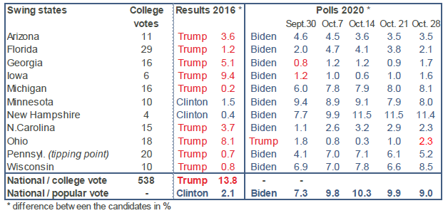 Les derniers sondages indiquent une modeste érosion de l’avance de Joe Biden au plan national et dans quelques états-pivot (tableau). D’après FiveThirtyEight, les démocrates sont aussi favoris à la Chambre à 98% et au Sénat à 76%.