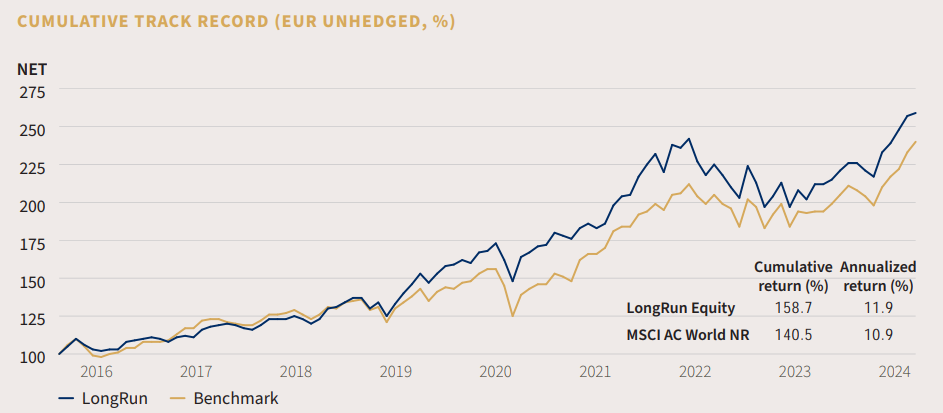 La stratégie a progressé de 8,1% (en EUR, non couvert) au premier trimestre, ce qui la place en retrait par rapport à l’indice de référence, qui a gagné 10,6%. Cette sous-performance à court terme était principalement due à nos investissements dans les entreprises exposées à la Chine, à nos sociétés de soins de santé et à notre position dans Adobe. Néanmoins, les rendements annualisés depuis le lancement de la stratégie il y a plus de huit ans se situent à 11,9% contre 10,9% pour les actions mondiales, ce qui se traduit par une surperformance annuelle de 1,0 point de pourcentage.