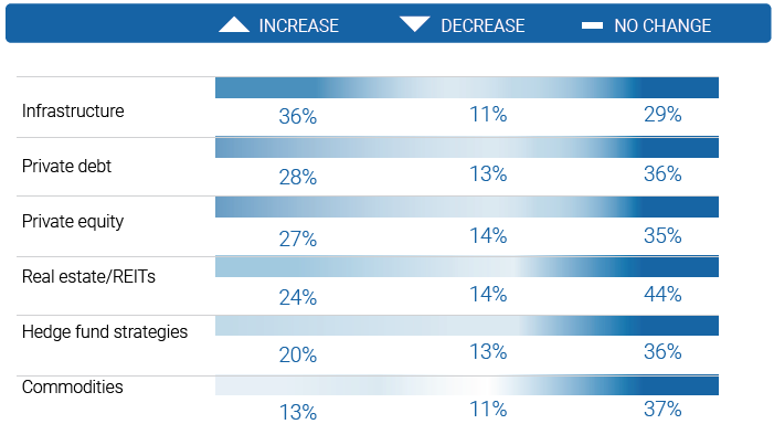 La combinaison de rendements incertains et d’un contexte de hausse des taux d’intérêt a forcé les institutions à regarder plus loin pour générer des rendements. Les répondants ont indiqué leur préférence pour les solutions de rechange et les actifs du marché privé. Les fonds d’infrastructures continuent de retenir l’attention de ce groupe, avec plus d’un tiers (36%) ayant l’intention d’augmenter leur allocations, suivi de la dette privée (28%), du capital-investissement (27%) et de l’immobilier (24%). La tendance vers les actifs du marché privé est reflétée par sept institutions sur dix (71%) qui affirment que les actifs privés contribuent à générer des rendements plus élevés, tandis que 60% disent qu’ils offrent une diversification.