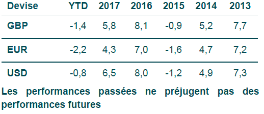 À fin juin, la duration en euro était nulle, alors que la duration totale était presque exclusivement issue d’actifs libellés en dollars: 2,1 ans pour les actifs en dollar américain; 0,3 an pour ceux en livre sterling.
