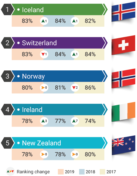 L’indice, basé sur des données obtenues auprès de sources fiables telles que de la Banque Mondiale et de l’OCDE, est constitué de 18 facteurs ayant un impact sur la vie des retraités. Avec une note moyenne de 83% contre 84% l’année passée, elle vient juste après l’Islande, mais devance la Norvège (80%), l’Irlande (78%) et la Nouvelle-Zélande (78%).