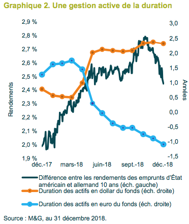 Au cours du second semestre 2018, ce positionnement s’est accentué et, à la fin de l’année, la duration des actifs en euro s’établissait à près de -1 an, tandis que la quasi-totalité de la duration positive était le fait des actifs en dollar américain : 2,3 ans pour les actifs en dollar ; 0,6 an pour ceux en livre sterling. Durant les premières semaines de 2019, et suite à la sensible évolution des emprunts d’État américains en décembre dont les cours intégraient désormais la fin du cycle de resserrement, nous avons fortement réduit la duration des actifs en dollar américain et porté à près de zéro la duration de ceux en euro.