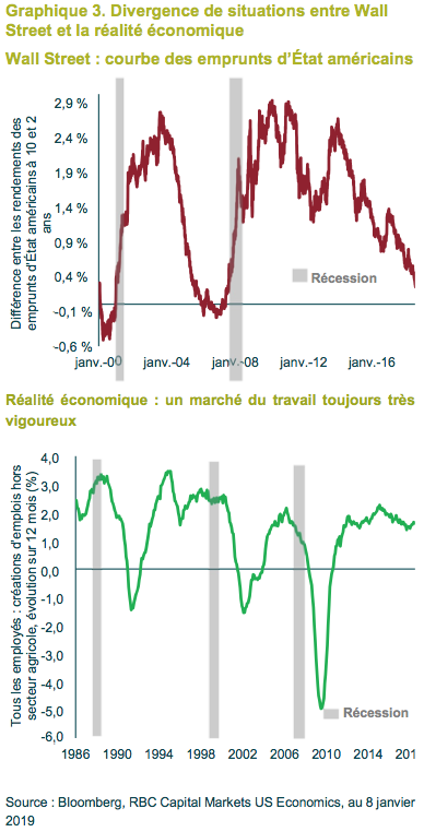 Au cours des derniers mois, les marchés se sont polarisés sur la quasi-inversion de la courbe des taux américaine et le risque de récession qui y est associé. Mais, la réalité économique est qu’il n’existe aucun signe de récession imminente et que l’économie réelle demeure vigoureuse (Graphique 3).