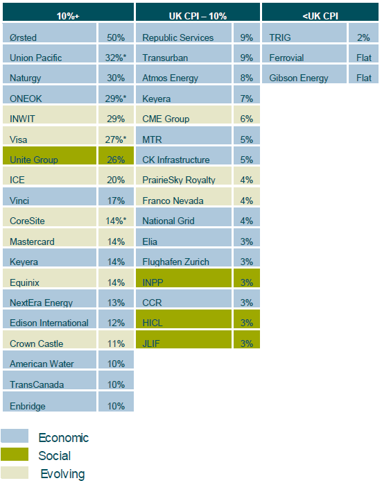 Nous investissons dans des sociétés dont nous prévoyons des distributions de dividende croissantes, persuadés qu’il s’agit là de l’indicateur ultime de la bonne santé de leurs activités. Nous avons été extrêmement satisfaits de la solidité de la croissance des dividendes au sein du portefeuille au cours de notre première année d’existence et de voir de nombreuses augmentations de plus de 10% dans l’ensemble des catégories d’infrastructure (Graphique 4).