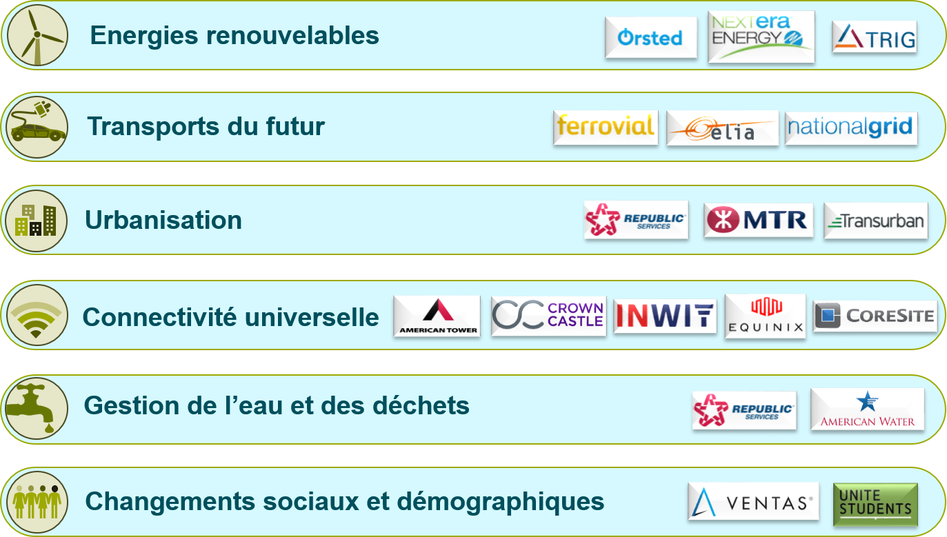 Toutefois, lorsque l’on pense aux infrastructures cotées et à leurs perspectives, il ne faut pas perdre de vue la nature thématique et à long terme de cette classe d’actifs. Il s’agit d’une classe d’actifs qui bénéficie de multiples tendances structurelles. La numérisation de la société et la transition en faveur des sources d’énergie renouvelables sont des exemples de ces tendances ; mais, ce ne sont là que deux des leviers de la croissance de plusieurs de nos positions.