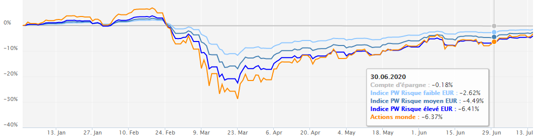 Ce rebond s’est également traduit par une forte reprise dans les portefeuilles aux différents profils de risque. Par exemple, l’indice Performance Watcher (PW) en monnaie EUR a rebondi de +9.71% pour le niveau de risque moyen pendant le 2ème trimestre (comparativement à +6.91% pour un risque faible et +13.12% pour un profil de risque élevé).