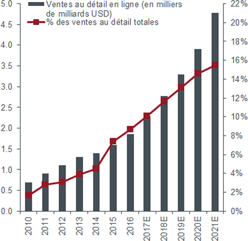 Source: e-Marketer, Prologis Research, MWPVL Supply Chain. Données estimées entre 2017 et 2021. Les estimations peuvent varier et ne sont pas garanties.