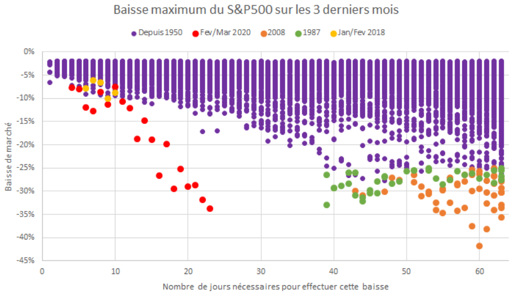 En 1987 et 2008, il a fallu entre 40 et 45 jours pour que le S&P 500 chute de 30% par rapport à sa valeur maximale. En comparaison, le choc de volatilité de 2020 a été très différent de 2008, car il aura fallu deux fois moins de temps pour atteindre la même perte (graphique).