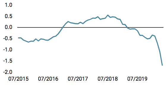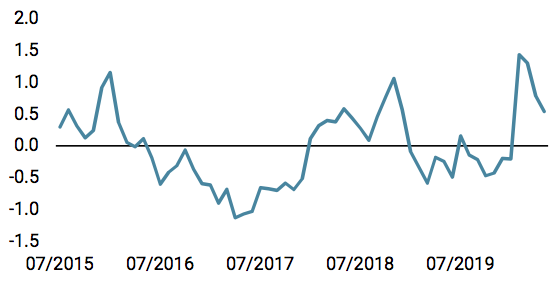 La situation macroéconomique joue un rôle important dans notre processus d’allocation dynamique. Nous la surveillons à l’aide de différents indicateurs comme nos «nowcasters» ainsi que des indicateurs à plus haute fréquence tels que nos «newscasters». La principale conclusion de ces indicateurs est que la situation macroéconomique est mauvaise (notre Nowcaster de croissance mondiale est à -2,87 écarts types, notre newscaster de croissance à -1,25) mais s’est stabilisée. Nous voyons même des signes d’amélioration: 69% des données de notre newscaster s’améliorent, tandis que 61% des données chinoises que nous examinons sont également en hausse. Le passage à travers de tels creux économiques a généralement abouti à la fin de la baisse des marchés.