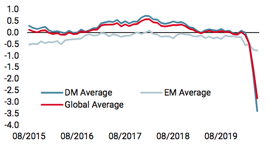 Les ratios cours/bénéfices pour les actions brossent un tableau clair: les valorisations sont partout élevées, les indices des marchés les plus développés se négociant dans leur 99e centile, sauf les indices japonais, et les ratios C/B sont plus élevés par rapport aux phases précédentes de baisse de l’activité. Néanmoins, il existe différentes manières d’analyser ces chiffres. Tout d’abord et surtout, elles ne tiennent pas compte du niveau du facteur d’actualisation. Étant donné l’amplitude de la baisse des taux d’intérêt au cours de la période, cet élément atténue fortement le signal provenant de simples mesures de C/B. Deux exemples clairs illustrent ce point. Une analyse du «carry» entre actifs (modèle de la Fed) comparant les rendements obligataires actuels aux rendements des actions indique que les actions des marchés développés et émergents sont très attrayantes. De plus, les faibles rendements obligataires abaissent le coût de la dette, affectant la rentabilité actuelle et future. Ainsi, la capacité de maintenir la croissance des bénéfices, ou de limiter sa baisse en raison d’une demande plus faible, est facilitée lorsque les taux d’intérêt sont aussi bas qu’actuellement. Par conséquent, la comparaison des ratios C/B actuels avec l’historique pourrait conduire à une sous-estimation de ces facteurs positifs.