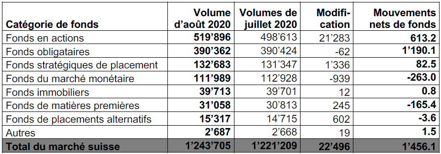 En août 2020, les investisseurs en Suisse ont confié CHF 1 243’705 mio à l’industrie des fonds (juillet 2020: CHF 1’221’209 mio).