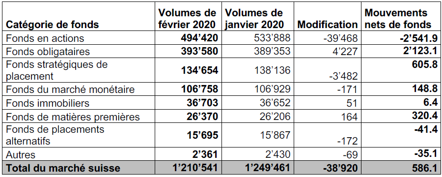 Les afflux de trésorerie nets ont représenté CHF 586,1 millions en février 2020. Les fonds obligataires (CHF 2,1 mrd) ont été en tête, suivis à une distance considérable par les fonds stratégiques de placement (CHF 605,8 mio) et les fonds du marché monétaire (CHF 320,4 mio). Les fonds en actions ont noté les plus forts désinvestissements (CHF -2,5 mrd). Le palmarès des catégories de fonds les plus prisées n’a subi aucun changement: fonds en actions 40,84%, fonds obligataires 32,51%, fonds stratégiques de placement 11,12%, fonds du marché monétaire 8,82%.