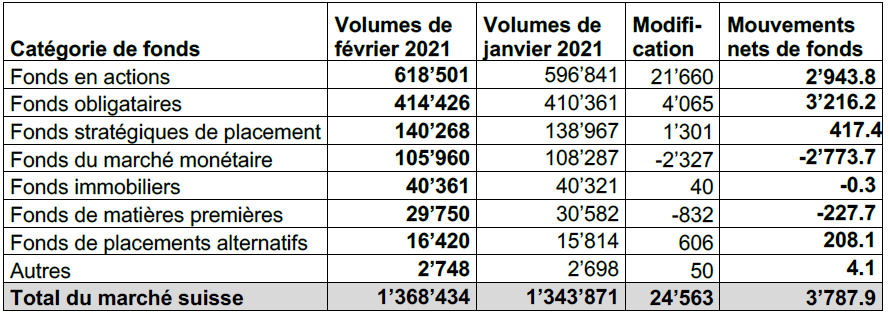 Les afflux de trésorerie nets ont représenté CHF 3,8 milliards en février 2021. Les fonds obligataires ont été en tête (CHF 3,2 milliards ), suivis des fonds en actions (CHF 2,9 milliards ). Des désinvestissements ont été enregistrés avant tout dans les fonds du marché monétaire (CHF -2,8 milliards ). Le palmarès des catégories de fonds les plus prisées n’a subi aucun changement: fonds en actions 45,20%, fonds obligataires 30,28%, fonds stratégiques de placement 10,25%, fonds du marché monétaire 7,74%.