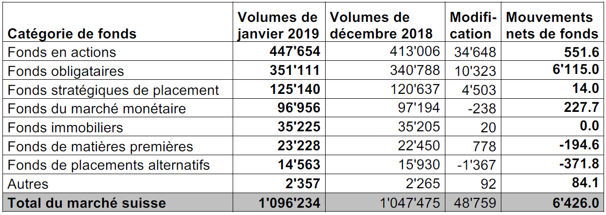 L’année 2019 a par contre débuté sous de meilleurs auspices, les marchés enregistrant un fort rebond. L’effet a été positif sur la masse détenue au travers de fonds de placement puisque le volume total s’établissait fin janvier à plus de 1’096 milliards de francs. Même si l’on reste sous le sommet des 1’140 milliards atteint fin juillet 2018, le creux de l’an dernier est déjà effacé puisque les volumes s’établissent légèrement au-dessus du niveau de décembre 2017.