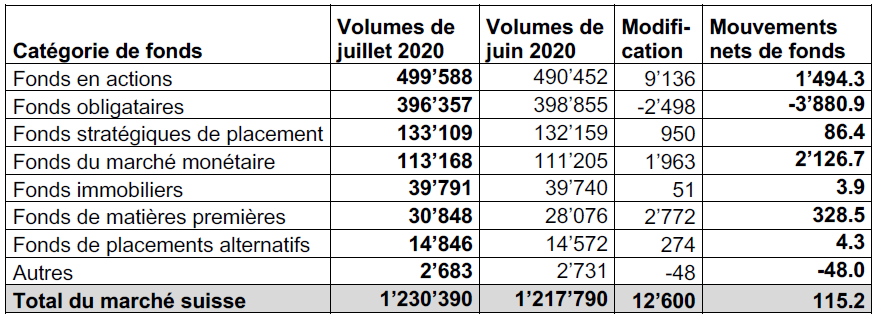 En juillet 2020, les investisseurs en Suisse ont confié CHF 1’230’390 mio à l’industrie des fonds (juin 2020: CHF 1’217’790 mio).