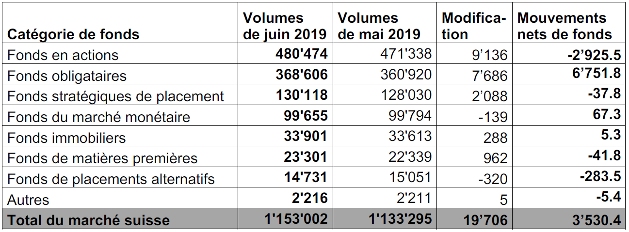 Le mois de juin a pour sa part bénéficié de la hausse des marchés afin de tirer vers le haut les volumes investis en fonds de placement. Le volume estimé à fin juin est ainsi de 1’153 milliards de francs, en hausse de 1.7% par rapport au mois précédent, et en hausse de 10% sur le premier semestre de cette année.