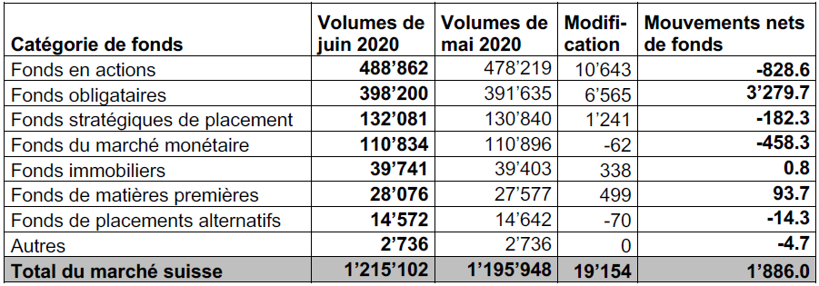 La fortune des fonds de placement recensés dans la statistique de la Swiss Fund Data SA et Morningstar s’est élevée en juin 2020 à CHF 1215,1 mrd. Par rapport au mois précédent, ceci correspond à une augmentation de CHF 19,2 mrd ou 1,6%. Les flux de trésorerie nets ont représenté CHF 1,9 mrd.
