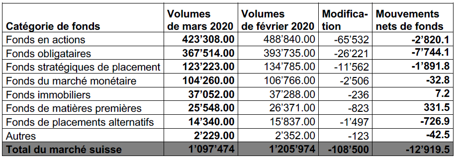 En mars 2020, les investisseurs en Suisse ont confié CHF 1’097’474 mio à l’industrie des fonds (février 2020: CHF 1’205’974 mio).