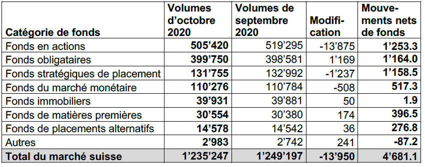 La fortune des fonds de placement recensés dans la statistique de la Swiss Fund Data SA et Morningstar s’est élevée en octobre 2020 à CHF 1 235,2 miliards. Par rapport au mois précédent, ceci correspond à une diminution de CHF 14,0 miliards ou -1,1%. Les flux de trésorerie nets ont représenté CHF 4,7 miliards.