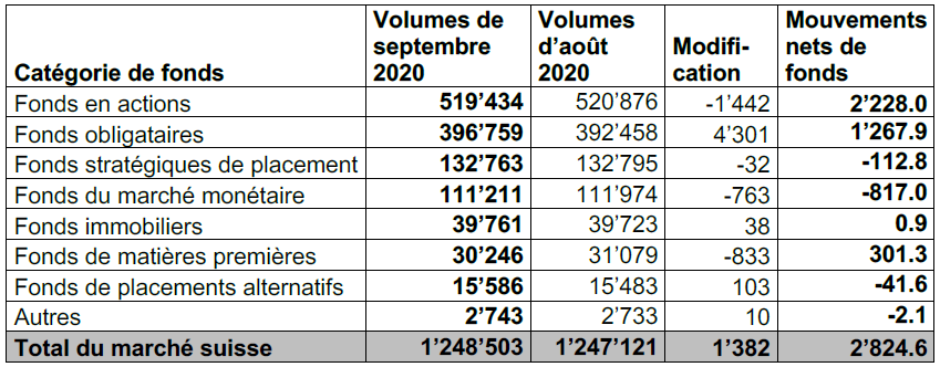 Le marché suisse des fonds pratiquement sans changement. La fortune des fonds de placement recensés dans la statistique de la Swiss Fund Data SA et Morningstar s’est élevée en septembre 2020 à CHF 1 248,5 mrd. Par rapport au mois précédent, ceci correspond à une légère augmentation de CHF 1,4 mrd ou 0,1%. Les flux de trésorerie nets ont représenté CHF 2,8 mrd.