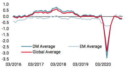 Notre Nowcaster d’inflation mondiale est devenu positif pour la première fois en presque un an le 18 janvier, atteignant un creux en mai 2020 à des niveaux survenant historiquement que 5% à 10% du temps. Un premier élément explique cette hausse: plusieurs facteurs de surprise de l’inflation américaine ont commencé à augmenter rapidement. Nos indicateurs d’inflation US sont devenus positifs à la mi-décembre, avant d’accélérer leur hausse dans les premiers jours de janvier. Cette accélération mérite d’être soulignée: elle reflète les enjeux de la situation actuelle. Tout d’abord, la rapidité de la reprise a déplacé le «pricing power» des consommateurs vers les producteurs. Cela a conduit à une accélération rapide de la composante «choc de l’offre» de notre indicateur surprise de l’inflation. La demande est forte et l’offre est limitée en raison de la pandémie: cela devrait faire grimper encore les chiffres de l’inflation.