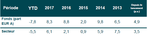 Depuis le début de l’année («YTD»), le Fonds a dégagé une performance nette totale de -7,8 % pour la part A d’accumulation en euro. Au sein des actions, nos positions longues sur les marchés développés, notamment l’Europe et le Japon, ainsi que sur certains marchés émergents ont subi des performances négatives.